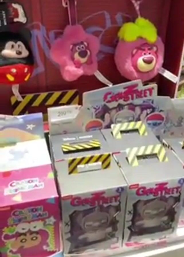 various displays of toy merchandise in a store, featuring items like plush keychains of Mickey Mouse, Lotso from Toy Story, and other cartoon characters, as well as boxed toys with cartoon themes