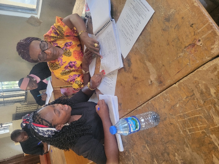 The image displays an indoor setting in the city of Bauchi, Nigeria, resembling a classroom or training room, with four individuals present. In the foreground, two adult females are seated at a worn, light brown wooden table, which exhibits prominent scratches, marks, and carvings. The woman on the left, with dark curly hair styled with a black, white, and red patterned headwrap, wears a black short-sleeved top and holds a blue pen. She is turned towards the woman on the right, appearing to listen or engage in conversation. The woman on the right, wearing glasses and a yellow patterned short-sleeved top, points with her right index finger at text within an open spiral-bound notebook lying on the table. Both women are surrounded by various loose papers, some containing printed text, indicating a study or instructional activity. A partially filled clear plastic "Swan" brand water bottle is positioned on the table to the left of the foreground subjects. In the background, an adult male in a black shirt and an adult female with a pink headscarf are seated at separate desks, each focused on writing in a notebook. The room features light-colored walls showing signs of wear and a window with a dark frame on the right side, admitting natural light.