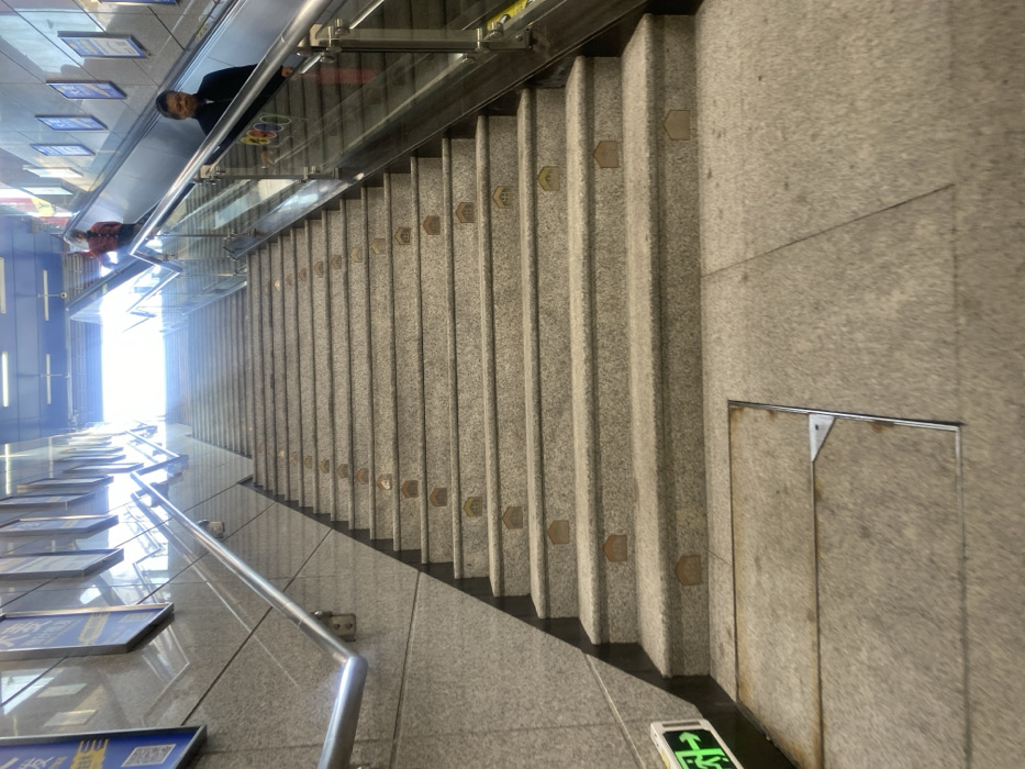 A long staircase stretches upwards, illuminated by bright light at the top. Metal handrails line one side. Small, arrow-shaped markers are inset on the front of each step. An escalator runs parallel to the stairs on the left, with people visible on it. A large metal access panel is situated on the wall to the right of the lower steps. An exit direction sign lies near the bottom of the stairs. The scene suggests a subway station.