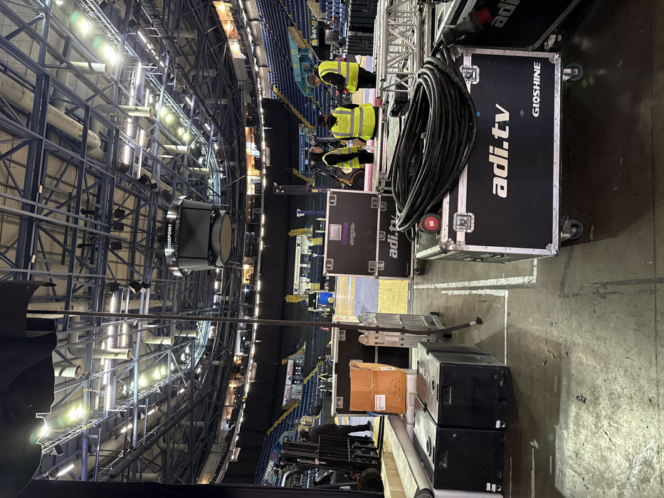 The image displays the interior of the Motorpoint Arena in Nottingham, United Kingdom. The scene shows an arena floor with visible basketball court markings, surrounded by empty, tiered blue seating. The environment features a high ceiling with exposed metal structural trusses, numerous lighting fixtures, and ventilation ducts. A large, multi-sided scoreboard, labeled "MOTORPOINT," hangs centrally from the ceiling. On the arena floor, numerous pieces of event equipment are visible. In the foreground and mid-ground, a collection of black equipment cases with silver hardware and wheels are present, some branded with "adi.tv" and "GIOSHINE" logos. One case carries a coiled black cable bundle with a red connector. Nearby are black speaker enclosures, an orange cardboard box, and a silver hand truck. A yellow Toyota forklift is parked on the far left. Four individuals are present. Three individuals, wearing high-visibility yellow vests, are conversing in the mid-ground right; one is seated on an equipment case, another stands facing them, and the third stands with their back partially to the camera. A fourth individual, dressed in dark clothing, stands near the forklift on the far left. Advertisement banners, including one for "Coors," are visible along the perimeter of the seating area.