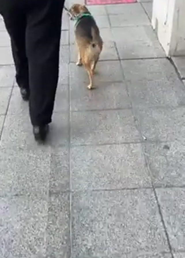 A dog is being walked on a leash along a city sidewalk with large square tiles. The dog has brown, black, and white fur, and is wearing a green collar. The person walking the dog is wearing black dress pants, black dress shoes, and a salmon-colored shirt. The person and the dog are walking away from the viewer. There is a building on the right side of the frame.