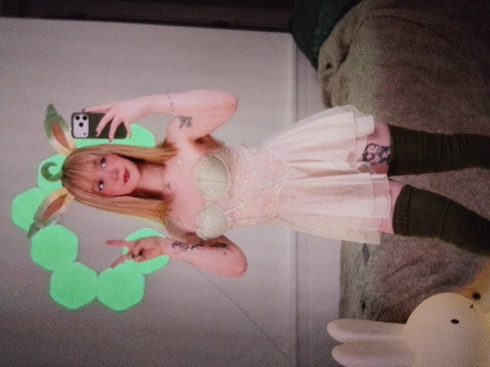An individual is captured in a selfie taken indoors, located in the city of Lares, United States of America. The subject, a person with blonde hair styled with bangs and light-colored skin, is wearing a light-colored, possibly pale pink or cream, tiered dress featuring a light green, shell-like bodice. Dark green, knee-high socks are worn on both legs. Tattoos are visible on the subject's right bicep area and upper left thigh. They are accessorized with a headband resembling green leaves or animal ears. A ring is present on the ring finger of the left hand. The subject holds a dark-colored smartphone with a visible dual-camera system in their right hand, extended as if taking a picture. Their left hand is raised, forming a peace sign (V-sign). Behind the subject on a light-colored wall is a glowing green, multi-lobed decorative item resembling a floral or abstract shape. To the right of the subject, a section of textured, possibly olive-green or brown fabric, likely part of furniture, is visible. In the bottom right foreground, a portion of a white, rabbit-shaped object or lamp is present. The overall lighting is soft.