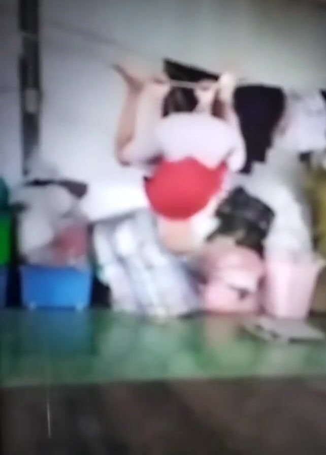 The video appears to be a shaky recording. Initially, an out-of-focus scene shows a child hanging upside down from what seems to be a clothesline, with laundry and various containers visible nearby. The camera then quickly shifts to a man with a shaved head, a mustache, and dark skin. He is wearing a light-colored shirt. The background seems to be an interior with a mixture of light and dark areas. The video is unstable and appears to be recorded in a haphazard manner.