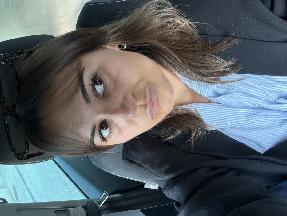 A female individual is depicted in a selfie-style portrait captured within the passenger compartment of a vehicle