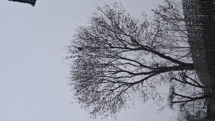 The image displays an outdoor scene in Differdange, Luxembourg, under an overcast, light grey sky. A large, leafless deciduous tree with prominent bare branches dominates the central and upper frame. A bird's nest is visible within the upper right section of this tree's canopy. In the lower left quadrant, smaller, bare trees or shrubs, some exhibiting pollarded growth, are present. A dark-colored fence or barrier extends horizontally across the lower third of the image. A white satellite dish, partially obscured by vegetation and bearing the inscription "ZON", is located in the far lower left. A dark roofline or architectural feature is partially visible in the upper right corner. No human figures or discernible animal activity, other than the nest, are observed.