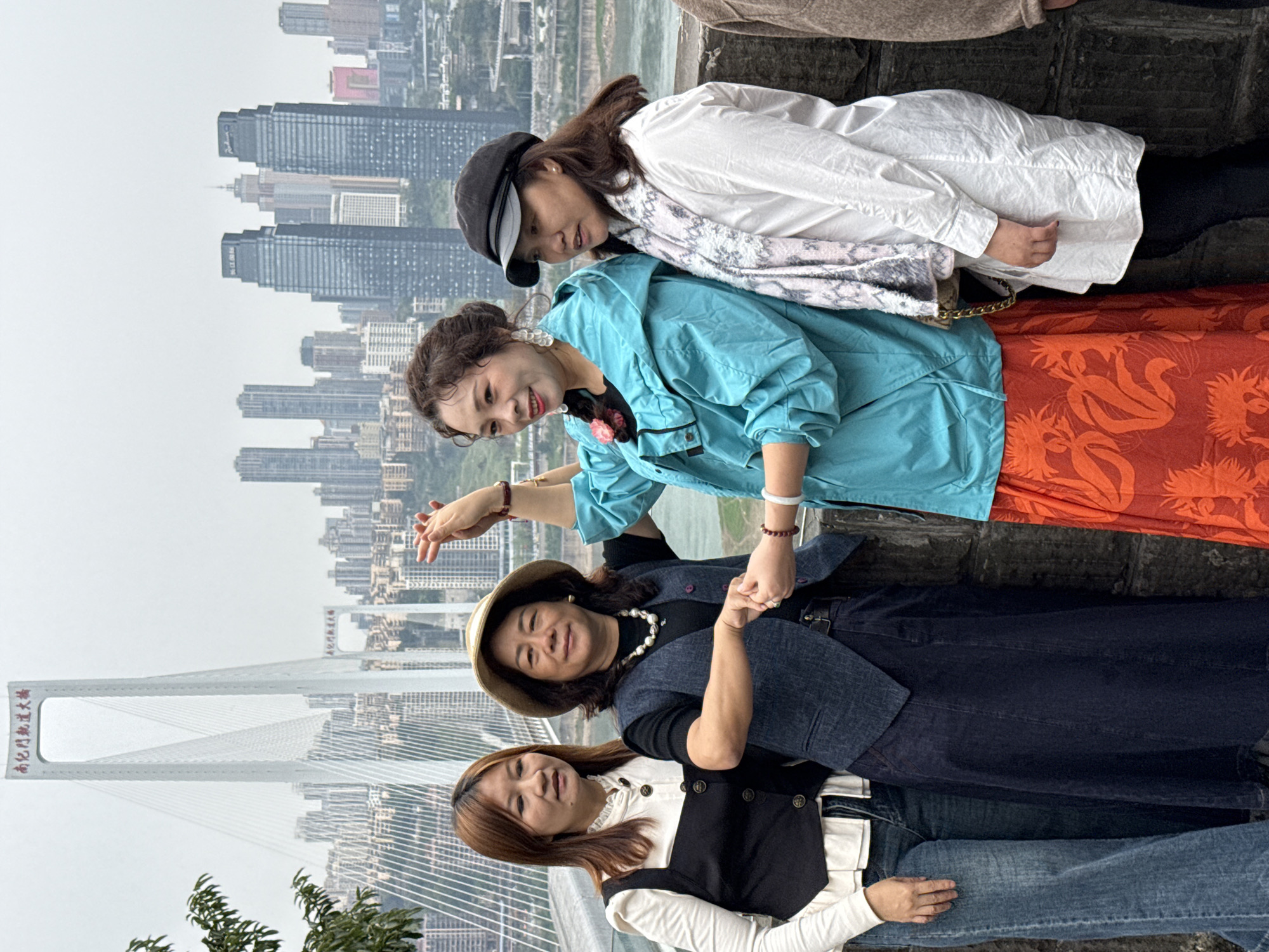 Four adult females are posed for a photograph outdoors in Nan'an District, Chongqing, China, positioned in front of a stone wall