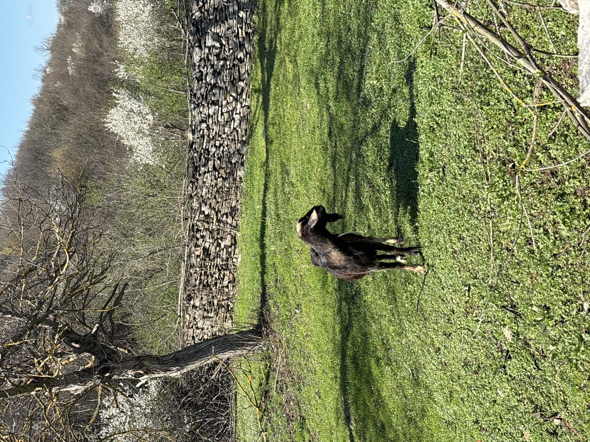 A goat stands on a grassy field in Karlukovo, Bulgaria. To the left is a stacked stone wall and bare-branched trees, with a hillside of mixed trees visible in the background under a clear blue sky. The goat, dark in color, faces away from the viewer. Sunlight casts shadows on the field. The ground cover is dense and low-lying.