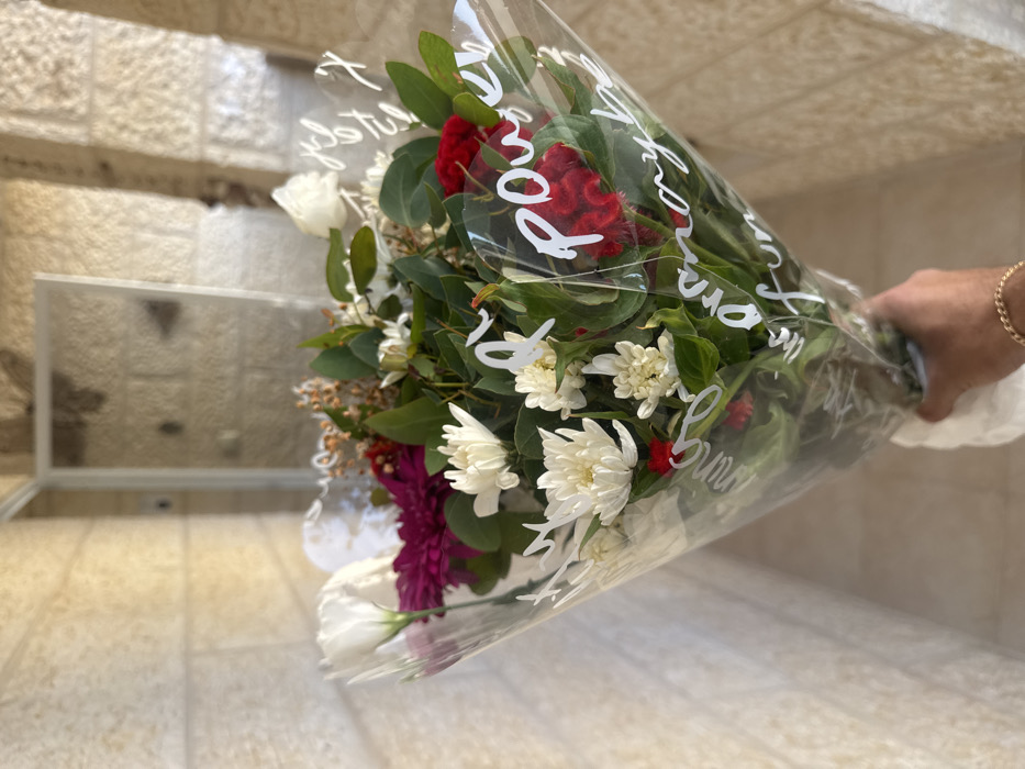 A male's right hand, adorned with a gold-colored chain bracelet, holds a mixed floral bouquet wrapped in clear plastic. The plastic bears white script lettering, notably featuring the words "power", "joyful", and "ordinary". The bouquet includes white chrysanthemums, dark pink dahlia-type flowers, red cockscomb, white eustoma, small red berries, a white rose, green eucalyptus foliage, and assorted filler flowers in white and brown tones. The background consists of a textured, light-colored stone wall. A blurry reflective surface, consistent with a glass door or window framed in a light color, is visible in the mid-ground, reflecting the stone wall. The scene is illuminated by natural light in Maale Adumim, Palestinian Territory.