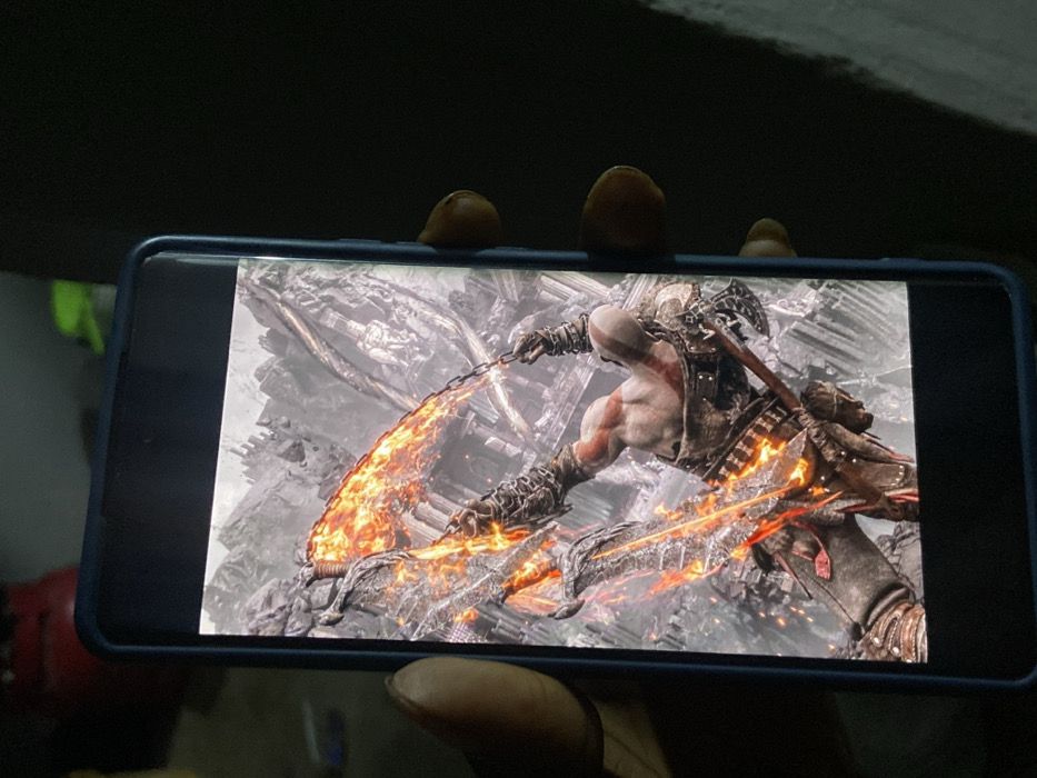 - "The image depicts a person holding a smartphone displaying a scene from the game God of War" by FM-8bUuM2, licensed under CC BY 4.0