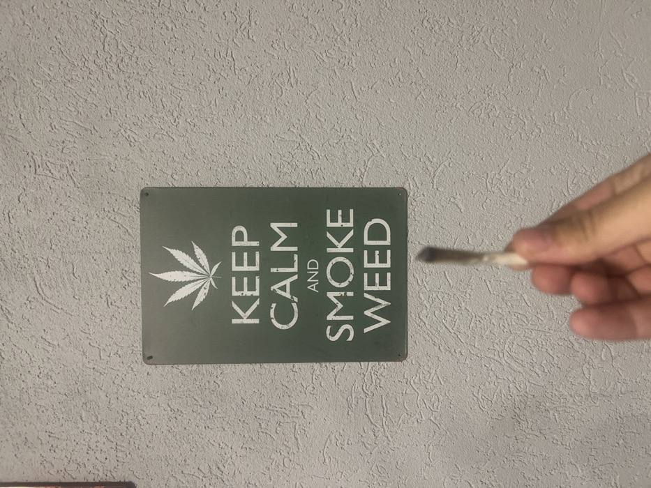 The image captures an indoor scene in Holon, Israel, depicting a light gray wall with a textured finish. Mounted centrally on this wall is a rectangular, dark green metal sign featuring distressed white text and a cannabis leaf graphic. The sign reads "KEEP CALM AND SMOKE WEED," with a stylized cannabis leaf positioned above the text. In the lower central portion of the frame, a human hand, primarily the thumb and forefinger, holds an unlit, hand-rolled cigarette, commonly known as a joint or spliff. The cigarette is thin, cylindrical, with a white paper and a dark tip. The fingers holding the cigarette are slightly out of focus, while the sign and the cigarette are in sharper focus. A partial view of another framed item is visible on the extreme upper left edge of the image.