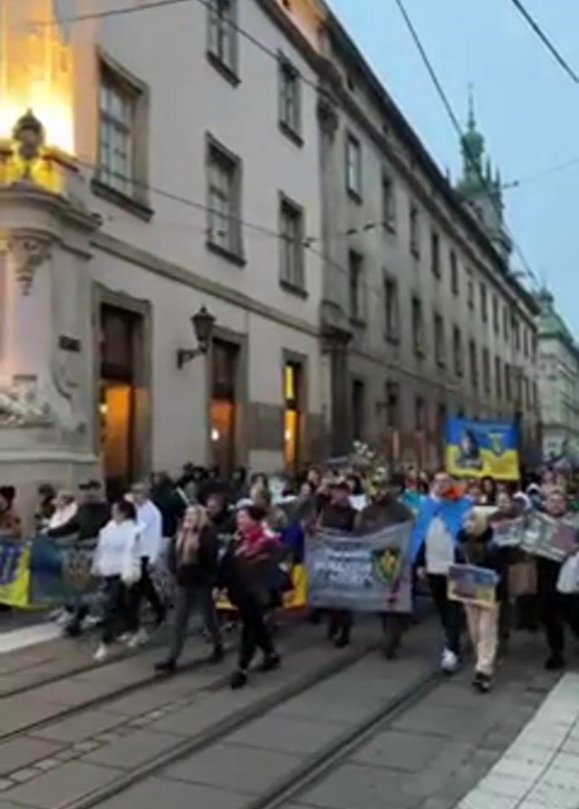 A crowd of people marches along a street in an urban environment. They are carrying Ukrainian flags, banners, and pictures, suggesting a demonstration or memorial procession. The buildings lining the street are multi-story and appear to be of European architectural style, with windows and architectural details visible. The sky is overcast. The people are walking on a street with tram tracks embedded in the pavement. They are moving at a walking pace, and some are holding up images and flags. The flags include the Ukrainian national flag. The banner reads "Нет войне, захваченной Россией", with "Нет войне" being in larger letters. Some people are wearing military attire, while others are dressed in civilian clothing. The camera appears to be held by someone within the crowd, moving along with the procession.