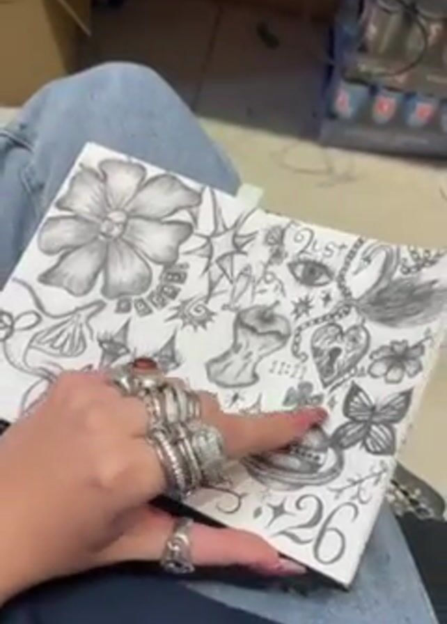 person sitting down with a sketchbook open on their lap. The pages of the sketchbook are filled with pencil drawings of various images, including flowers, hearts, eyes, butterflies, and abstract shapes. The person's hands are adorned with multiple rings. The background is cluttered with items, including a box, a case of drinks, and other unidentified objects. The overall scene appears casual and informal, suggesting a personal or creative space.