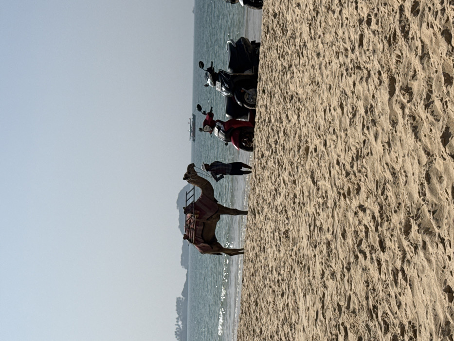 A camel stands on a sandy beach near the water's edge, saddled and ready for a ride. A person stands nearby, seemingly in charge of the animal. The scene includes several parked motorbikes on the beach. In the background, there's a view of the sea and a distant landmass. The sky is clear and bright. The sand is textured and makes up a significant portion of the image.