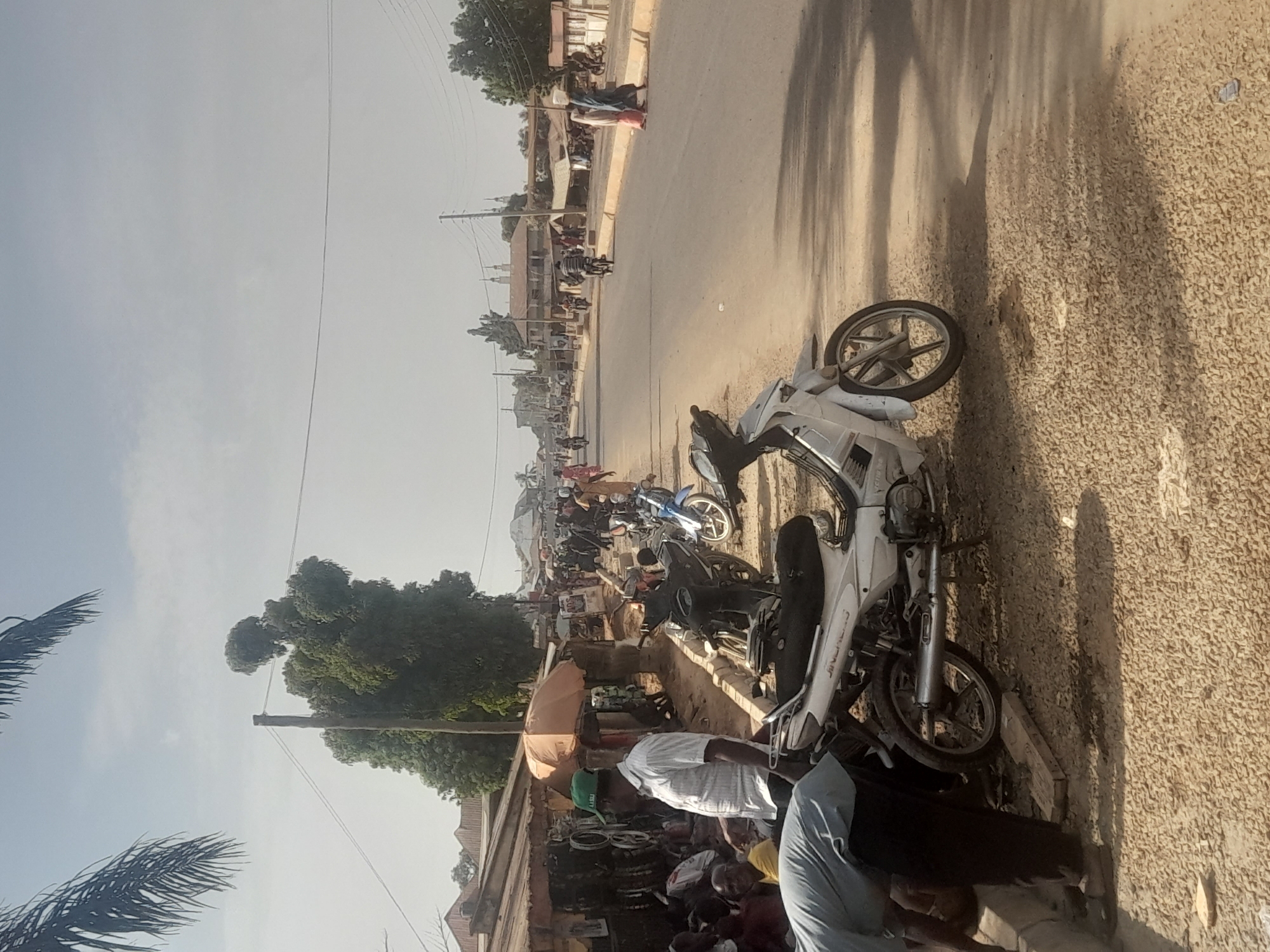 The scene depicts a bustling street in Ube, Nigeria, under a hazy, light blue-grey sky. The perspective is from the unpaved shoulder of a paved, two-lane asphalt road, looking into the distance. On the immediate left foreground, a male subject in a light blue shirt and dark trousers is bent over, facing away from the camera, attending to an object on the gravel and dirt ground adjacent to the curb. A white JINGCHENG motorcycle with dark trim is parked on its kickstand to his right, partially obscuring the view of the curb and the subject's interaction. Midground left, a male subject in a white short-sleeved collared shirt and a green baseball cap (with "AASU" visible) stands, facing right, observing the street. Behind him, several individuals are gathered around market stalls displaying various goods, including what appear to be bicycle tires and rims. An orange umbrella provides shade over a section of these stalls. Multiple motorcycles are parked along this unpaved shoulder. On the paved road, pedestrians and motorcyclists are active. A female subject in a long blue garment walks towards the left, carrying a white container on her head. Another female subject in a brown garment walks nearby. Further down the road, a male subject is seen operating a motorcycle away from the camera's perspective. Structures lining the street include single-story market buildings on the left. In the distant background, on the right side of the road, a multi-story building with two small, domed structures (consistent with minarets) is visible. Utility poles with multiple overhead wires run along both sides of the road. Vegetation includes prominent palm fronds in the upper left, and dense green trees behind the market stalls and in the distance. Strong, distinct shadows are cast by objects and subjects, indicating direct sunlight. The unpaved areas are composed of light brown gravel and dirt.