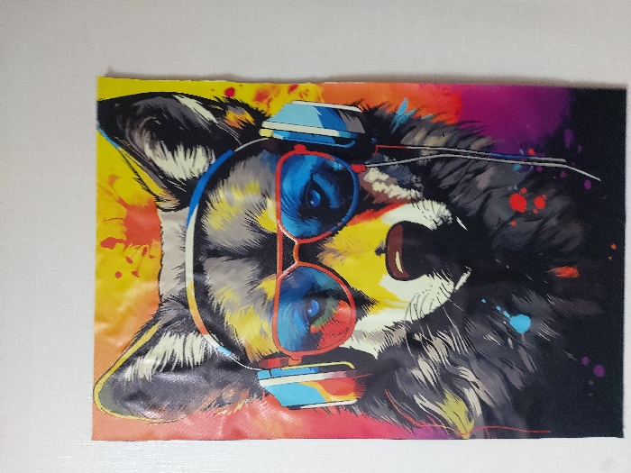 - "The image, captured in Gimpo-si, South Korea, displays a vertically oriented, vibrant pop-art print of a dog's head, resembling a husky or wolf, positioned against a plain light-colored wall" by FM-xMf1b2, licensed under CC BY 4.0