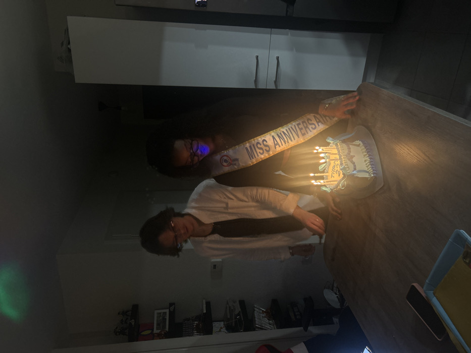A person wearing a sash that says "Miss Anniversaire" stands near a lit birthday cake on a wooden table. The cake has many candles. Another person, also wearing glasses, stands beside the table with a knife. The setting is indoors, with white cabinets in the background. Lower shelves hold decorative items. The scene is dimly lit, with the candlelight illuminating the cake and people.