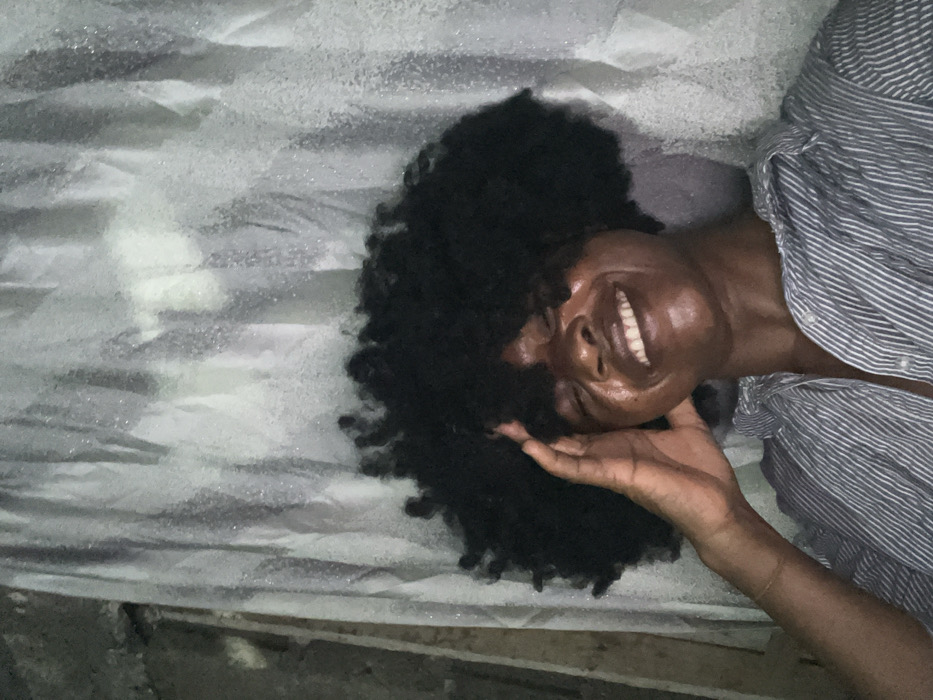 This image, captured in Iranla, Nigeria, depicts a dark-skinned individual from the chest up. The individual, appearing to be a young adult, has a voluminous dark afro hairstyle. Their eyes are closed, and they are smiling broadly, revealing white teeth. A glossy sheen is present on their face. They are wearing a light-colored, vertically striped collared shirt. The individual's right hand is raised, with fingers resting against the right side of their head. The background features a light-colored, possibly white or grey, vertically folded and textured fabric or curtain that reflects ambient light. To the immediate left of the fabric, a darker, rough-textured surface, resembling an unfinished wall or wooden structure, is visible.