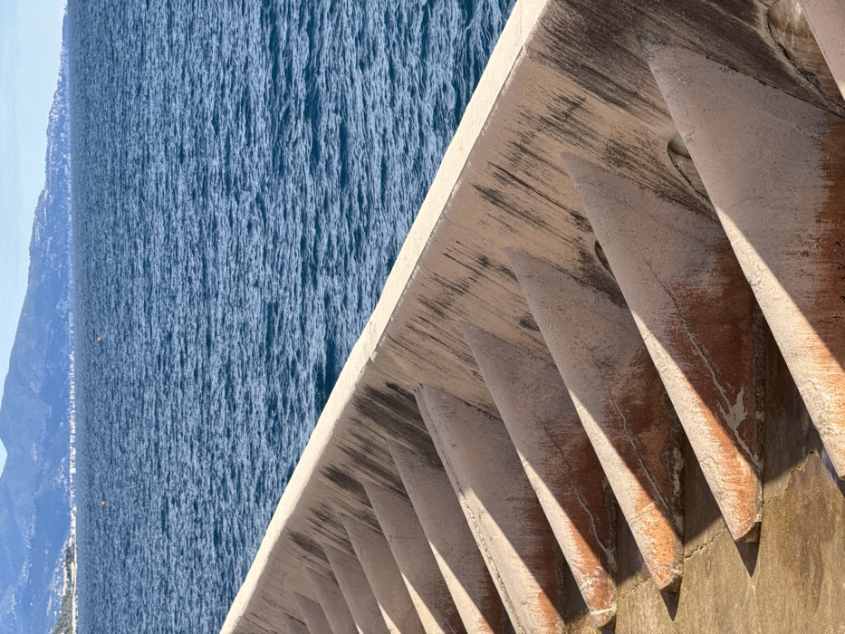 This image depicts a coastal scene on a clear, sunny day along the Monégasque coastline in Monaco. The foreground is dominated by a weathered concrete sea wall or breakwater, extending diagonally from the lower left to the upper right. This structure features a series of approximately nine distinct, triangular or wedge-shaped buttresses or projections, casting prominent shadows to their right, indicating strong sunlight from the left. The concrete exhibits varied coloration, from light beige to reddish-brown, with numerous dark, vertical streaks of grime or algae on its upper, exposed surfaces. Beyond the concrete structure, the midground is filled by the deep blue, subtly rippled waters of the Mediterranean Sea. Two small, orange spherical buoys are visible on the water in the distant midground. The background reveals a hazy mountain range with some visible vegetation under a pale blue sky, with a densely built-up urban coastline discernible at the base of the mountains, suggesting a populated area adjacent to the sea. No individuals, explicit actions, or direct interactions are visible.