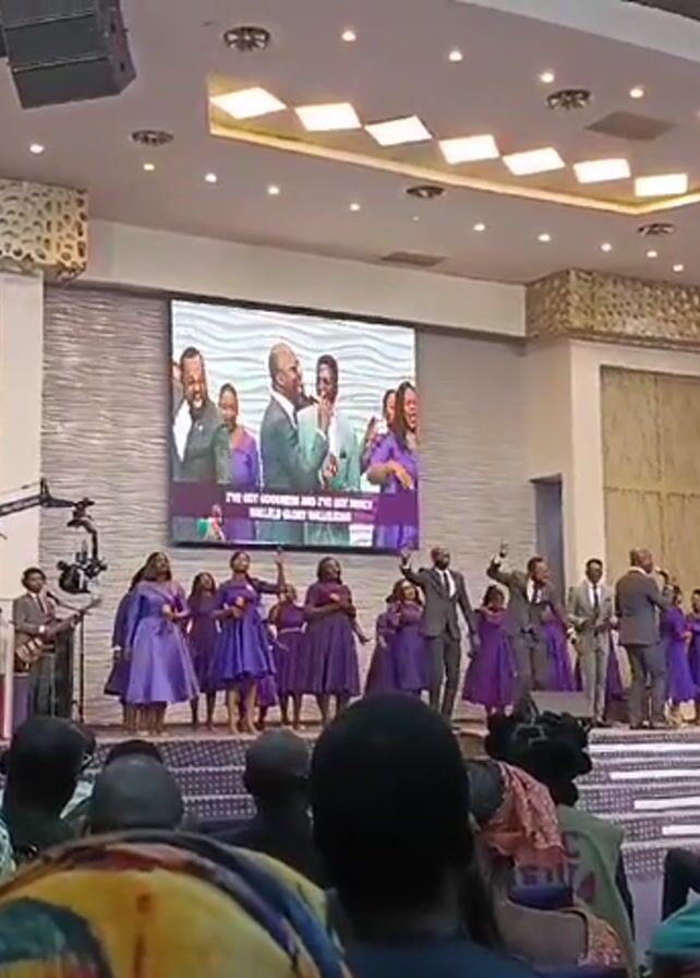 A church choir is performing on stage to a crowd. The choir is wearing purple robes, and the musicians are behind them. There are three large screens displaying the performance with lyrics on either side. People are watching the performance.