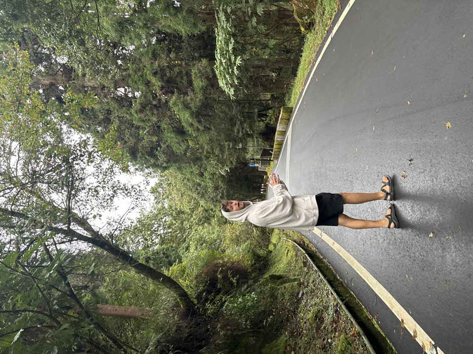 A male individual stands on a wet, paved road in a densely forested area of Alishan Township, Taiwan