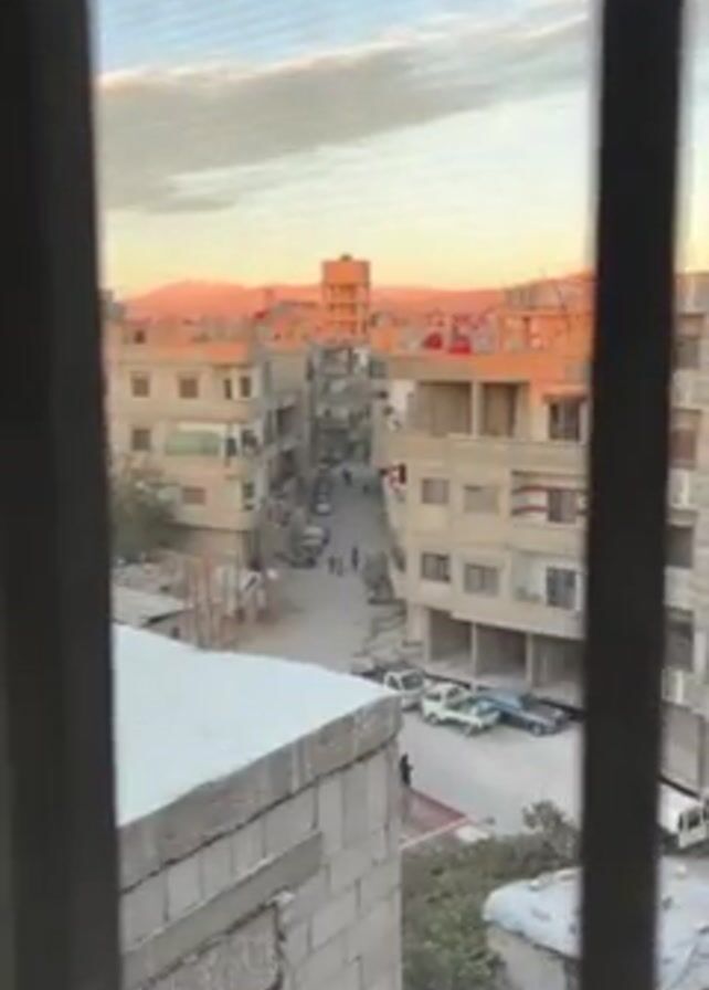 The video depicts an urban street scene, viewed from an elevated position, possibly a window. The street is lined with multi-story buildings constructed from light-colored materials, likely concrete or brick. The buildings show signs of wear and some appear to be under construction or incomplete. In the background, there are mountains faintly visible against a sky tinted with the warm hues of sunrise or sunset. The street below is narrow and cluttered with parked cars. A motorcycle is seen driving down the center of the street, along with several pedestrians, including two children in blue jackets, a person wearing a hijab and carrying a bag, and a person wearing what looks like a winter jacket. The street is crisscrossed with overhead wires. A truck with green foliage attached to it is parked to the right.