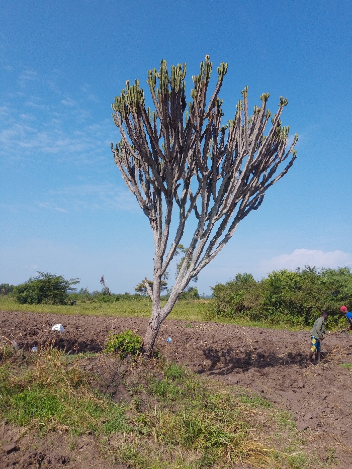 A tall, leafless tree stands prominently in a field of tilled soil under a bright blue sky. The tree's branches reach upwards, some with small green tips. Two people are working in the field, their figures blurred in the distance. Patches of green grass and other vegetation dot the foreground. In the background, low-lying green trees and shrubs can be seen along the horizon. The scene suggests a rural landscape, perhaps an agricultural area under cultivation.