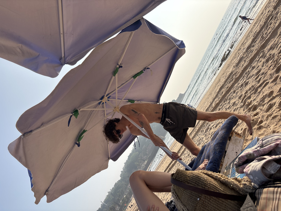 The image portrays a beach scene in Sinquerim, India, under a clear, light blue sky. In the foreground, the lower legs and feet of an individual are visible on the left, resting on a blue patterned cushion or towel on a beach chair. A woven brown bag with a leather strap is positioned in front of these legs. Centered in the midground, a young adult male stands shirtless, wearing dark swim trunks with a visible "Calvin Klein" waistband. He has curly brown hair and dark sunglasses. Tattoos are present on his left arm and lower right abdomen. He is holding the white pole of a large, open, light purple beach umbrella with both hands, positioned over light brown sand marked with footprints. Another similar light purple beach umbrella is partially visible to the right, adjacent to the first. The background features the ocean with gentle waves extending across the frame. A lone, small figure is visible walking along the distant waterline on the right. To the far left, a lush green hillside with visible structures rises from the shore.