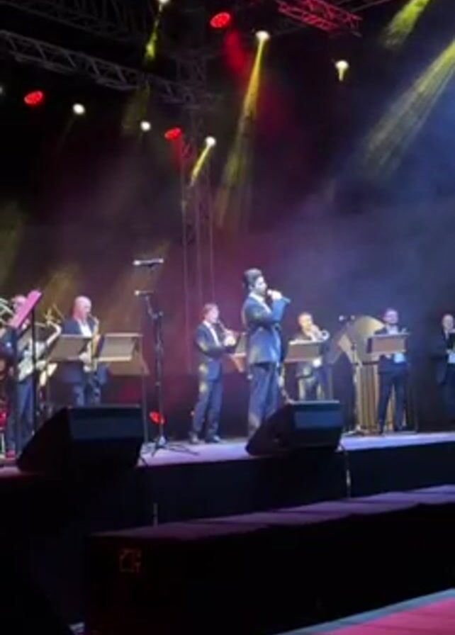 A man in a dark suit is singing on a stage, backed by a band in matching suits