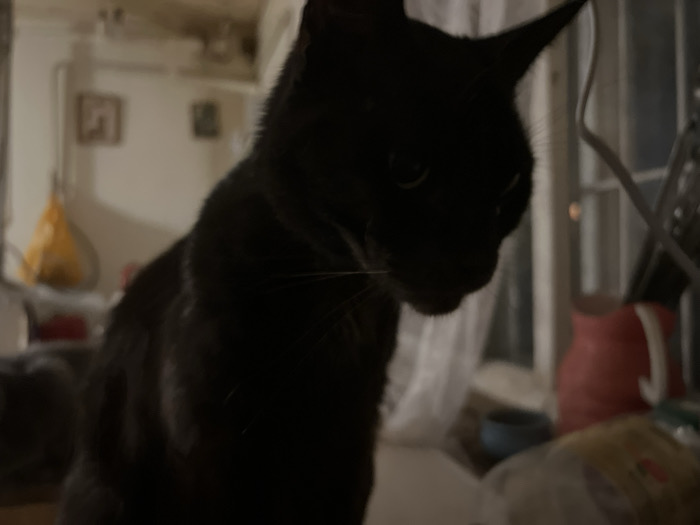 The image captures a dimly lit indoor scene, identified as being in Kolomna, Russia. The central subject is a black domestic cat, partially silhouetted and positioned in the center-right of the frame, facing downwards and slightly to the right. Its eyes are faintly visible, reflecting some light, and subtle whiskers extend from its muzzle. Both ears are erect. The background on the left features a light-colored wall with two framed items hanging. A white pipe runs horizontally across the upper section of this wall, and a yellow plastic bag is suspended further down on the left. The right side of the background reveals a window covered by light-colored, translucent curtains, which serves as a primary light source, creating a backlit effect on the cat. In the mid-ground, beneath the window, several objects are arranged on a surface. These include a red pitcher with a handle, a small dark blue bowl to its left, and a light-colored package, possibly containing food, situated further to the right. The overall lighting conditions are low, relying on ambient light from the window.