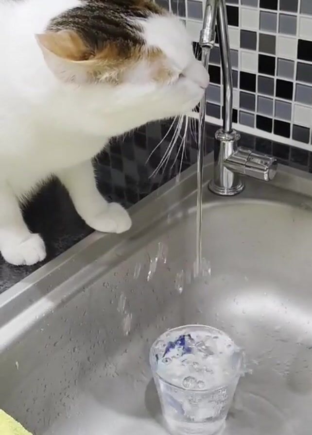 - "A white and brown cat stands on a kitchen counter near a stainless-steel sink, lapping water directly from the stream emanating from the tap" by FM-PPRef1, licensed under CC BY 4.0