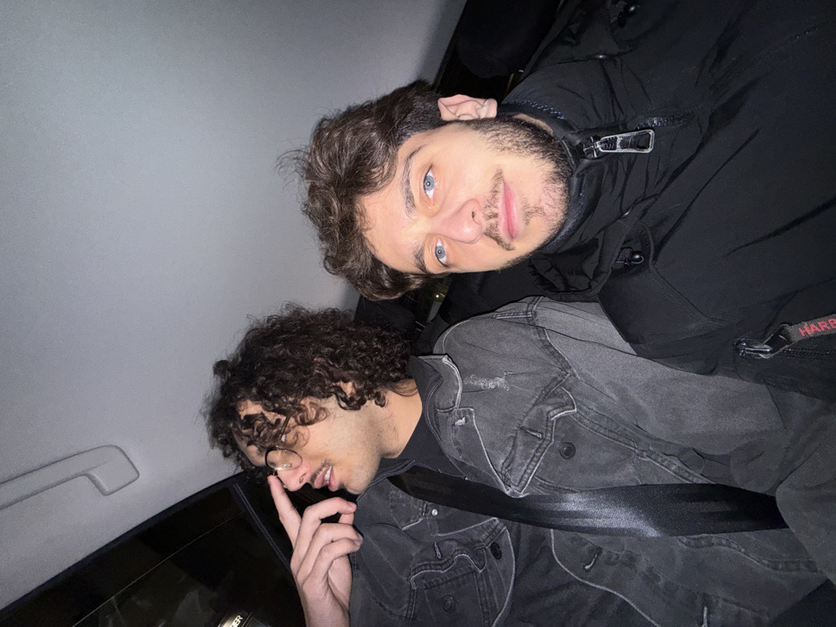 Two young men pose for a selfie inside a car. The man closer to the camera, on the bottom left, has dark curly hair, glasses, and a denim jacket. He holds a finger to his nose. The other man, on the upper right, has short brown hair, a beard, and blue eyes. He wears a black puffy jacket. Both have seatbelts on. The interior of the car is mostly dark, with a light gray ceiling.