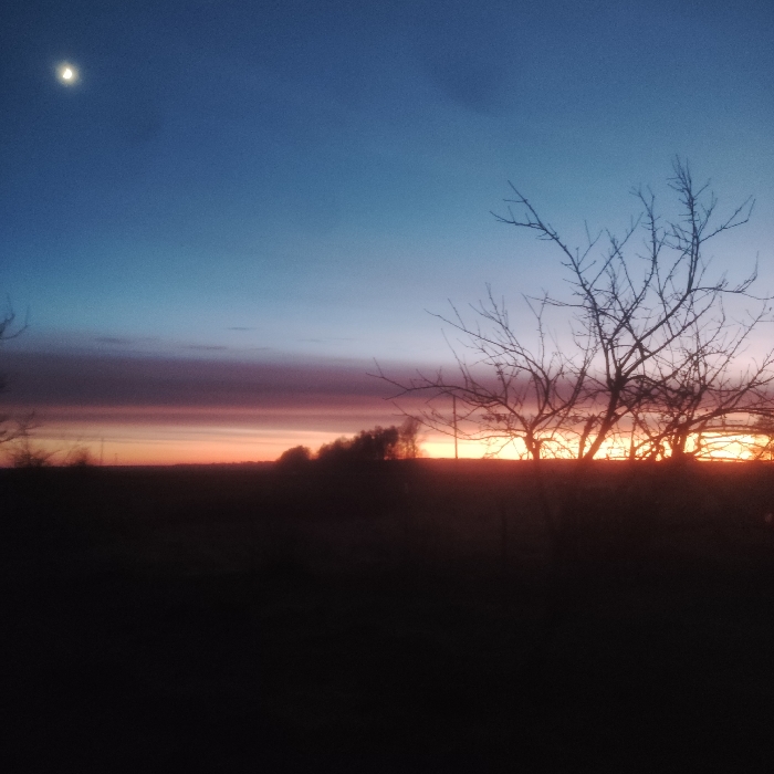 The image displays a twilight landscape located in Лунненскі сельскі Савет, Belarus. The sky transitions from a deep blue at the zenith, through lighter blue, to a prominent horizontal band of pink, purple, and orange clouds that meet a bright orange glow at the horizon. A distinct white crescent moon is visible in the upper-left portion of the frame. Silhouetted against the colorful sky are several bare deciduous trees with visible branches and twigs, primarily positioned on the right side of the image. The foreground consists of an undifferentiated, dark expanse of ground. No human subjects, animals, specific man-made structures, or discernible actions or interactions are present in the scene.