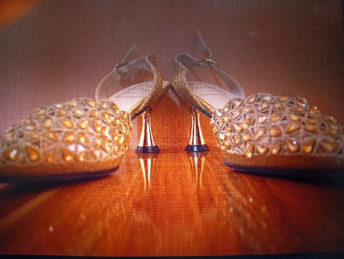 - "A pair of golden, high-heeled women's shoes is depicted, positioned symmetrically on a highly reflective, dark reddish-brown surface" by FM-iVQs23, licensed under CC BY 4.0