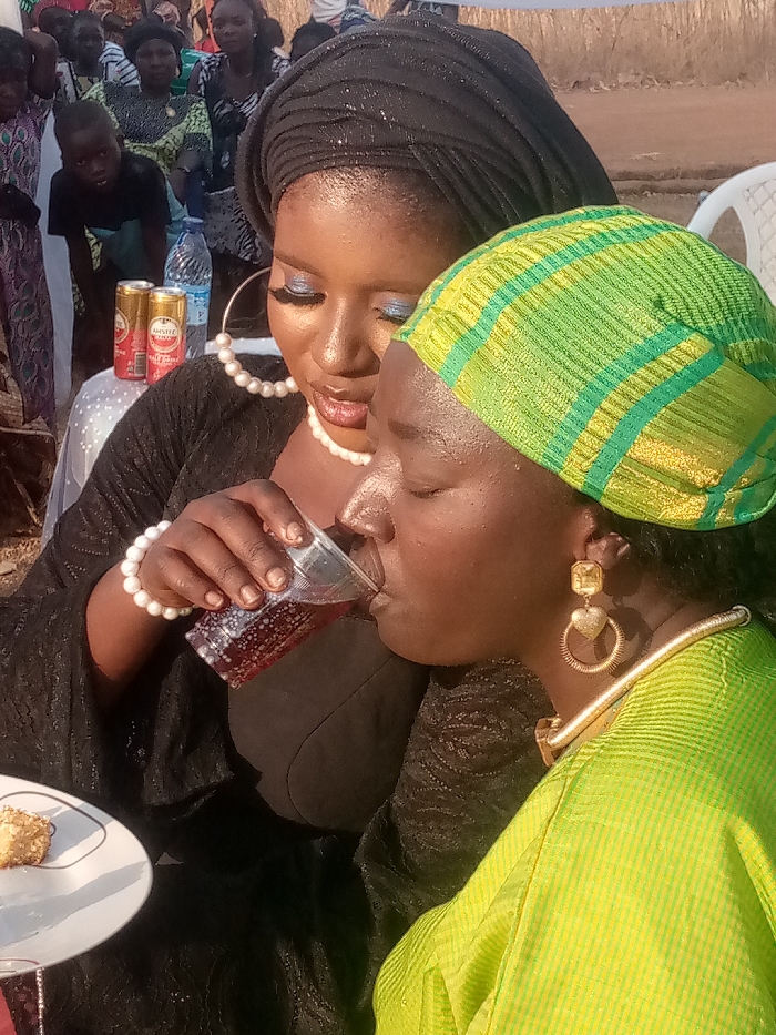 Two women are closely positioned, one assisting the other in taking a drink. The woman on the left is wearing a black head covering, large pearl earrings, a matching pearl necklace, and a black dress with a patterned overlay. She holds a clear plastic cup filled with a dark beverage. The woman on the right is drinking and has a green and gold striped head covering, gold earrings, and a matching gold necklace. A partially eaten snack sits on a white plate nearby. In the background, other people can be seen.