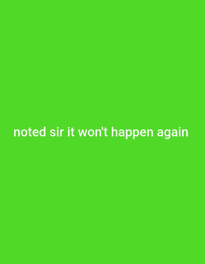 The image displays a digital screen featuring a uniform green background (RGB: 76, 204, 76; Hex: #4CC44C). White, sans-serif text is centered horizontally and positioned in the lower-middle section of the screen, stating, "noted sir it won't happen again." No individuals, physical objects, or other environmental details are visible within the image frame. The location is Rijiyar Zaki, Nigeria.