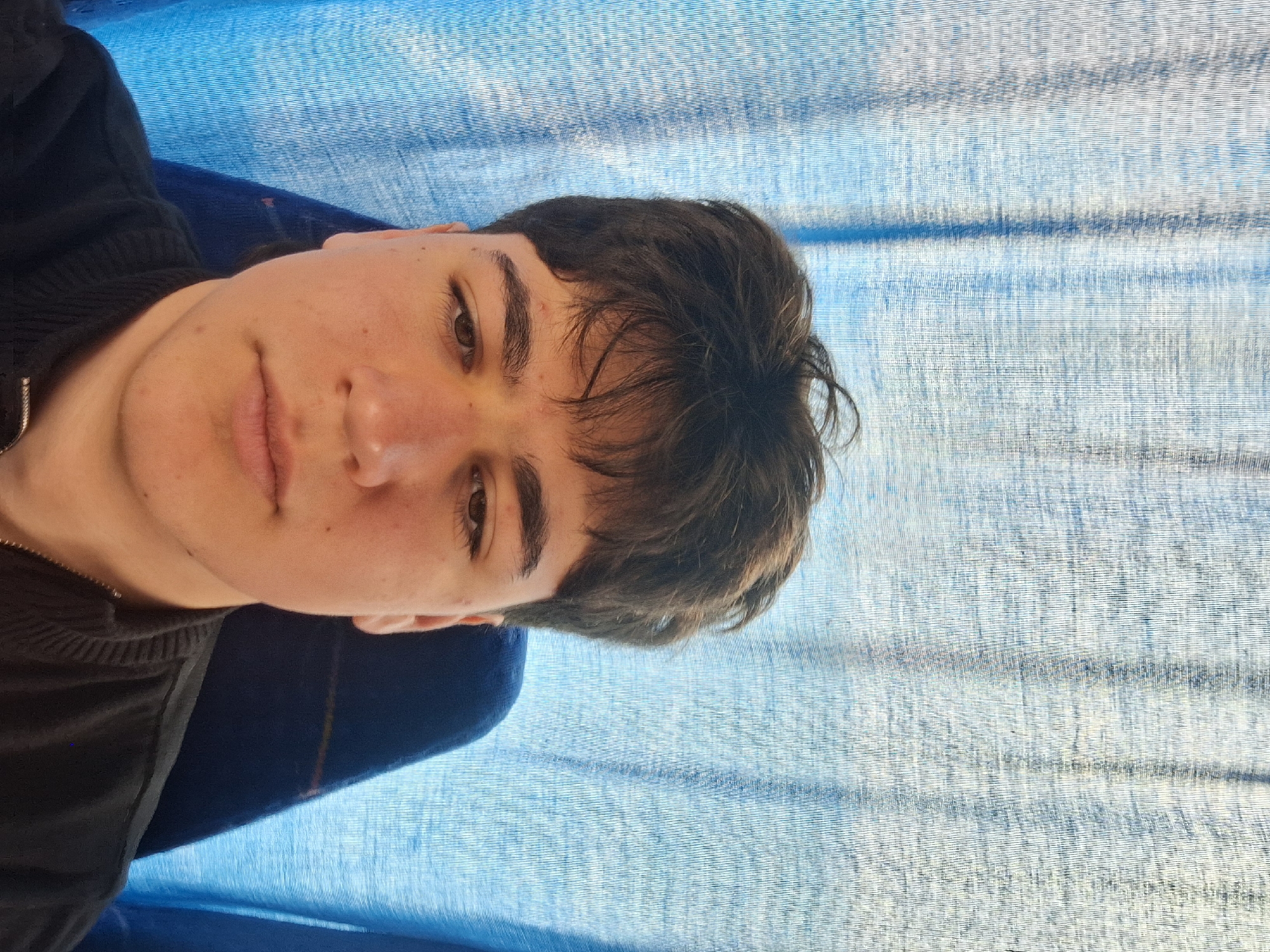 A young male individual is depicted in a close-up, chest-up portrait, reportedly in the city of Polsko Padarevo, Bulgaria. He has dark brown, slightly unkempt hair and light skin, with visible pores and minor blemishes on his forehead and cheeks. His brown eyes are directed downwards, not making eye contact with the viewer, and his expression is neutral. He is wearing a black zippered jacket or sweater, featuring a ribbed collar and what appears to be a silver-colored zipper pull on the lower right. The background on the left consists of a light blue, semi-transparent, vertically striped curtain or mesh material, likely covering a window, with diffused light visible through it and darker blue folds. To the right, behind the subject's right shoulder, a dark blue fabric seat back, possibly from a bus or train, is partially visible, with a lighter blue strip or pattern near its top edge.