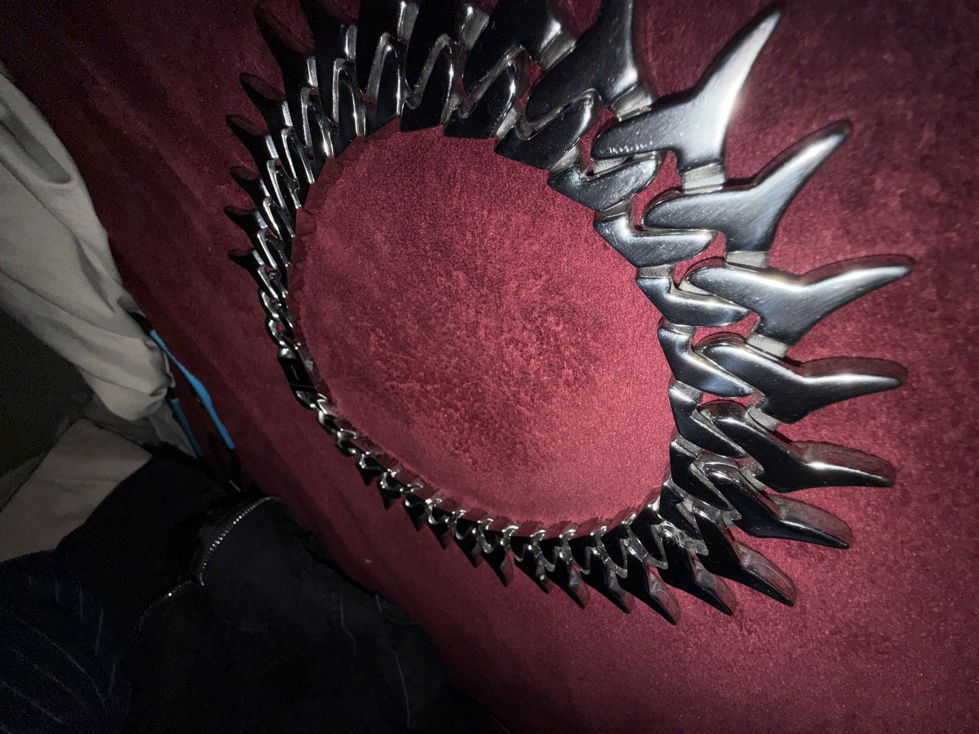 A polished, silver-colored metal chain, possibly a necklace or collar, is positioned in a roughly circular arrangement on a deep red, textured fabric surface, likely velvet or suede. The chain consists of numerous interconnected links, each designed with a distinctive, sharp, and pointed, stylized shape, resembling teeth or spikes. The metal reflects ambient light, highlighting its smooth, lustrous finish, with some visible minor wear or smudges. To the upper left of the chain, a portion of a dark, likely black, fabric object is visible, featuring a metallic zipper. Behind this, lighter-colored, possibly beige or off-white, fabric is present. No individuals are depicted, nor are any actions or interactions observed. The environment appears to be an interior space, dimly lit. The image itself provides no visual information to confirm a location within the city of Massy, France.