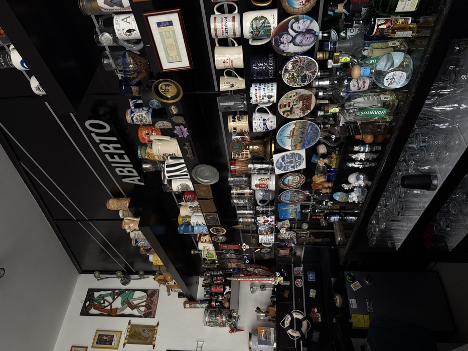 The image showcases a crowded interior, possibly a bar or restaurant, with an array of decorative items displayed on shelves and walls. Mugs, plates, and bottles line the shelves, while artwork and various memorabilia adorn the walls. The word "ABIERTO" is prominently displayed. The scene appears cluttered yet curated, creating a visually stimulating environment. Glasses and a refrigerator are also visible in the background.