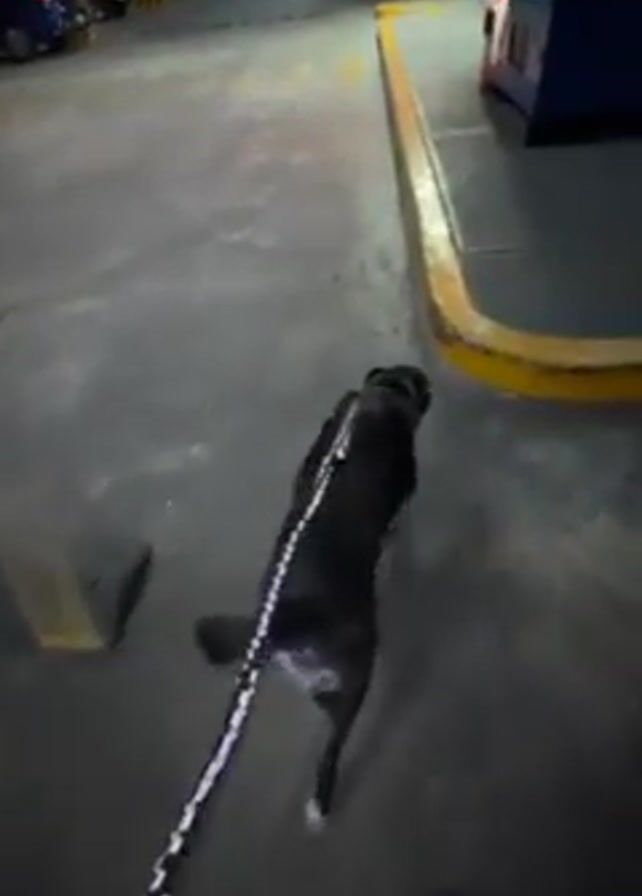 A person holds a leash attached to a medium-sized black dog with some gray patches. The dog walks along the edge of a yellow painted curb in a dimly lit parking garage. A vending machine is visible to the right of the dog and curb. A few cars are parked in the background.