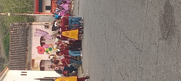 A crowd lines a street, presumably for a parade. Many wear red shirts, while some hold paper flowers and other decorations. A yellow banner is visible in the front. Buildings with faded paint and tile roofs stand beside the street. A smaller group in colorful, traditional clothing is further up the road. The road surface is cracked and gray.