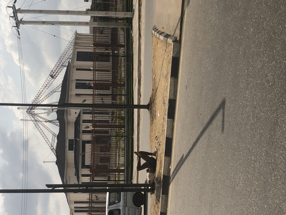 This image captures a daytime urban street scene in Owerri, Nigeria. The foreground consists of a gray asphalt road, bordered by a concrete curb with alternating black and white painted sections. Adjacent to the curb is a dry, light brown grassy median strip. An individual is observed lying supine on this median strip, positioned next to a dark utility pole. They are wearing dark shorts and a light-colored, possibly patterned, top. Their knees are bent, and bare feet are visible. Two pairs of dark sandals are placed on the ground near their head. A white commercial van, partially visible on the road to the left, displays text identifying it as "IMO STATE TRANSPORT WORKERS" and "COUNCIL," and the building as "IMO STATE SECRETARIAT ANNEX." Directly behind the median strip and utility poles, a tall, dark metal fence encloses the perimeter of a large, light-colored building. This building features multiple rectangular windows and a dark roof from which a prominent, complex metallic truss structure extends upwards. The sky is partially cloudy.