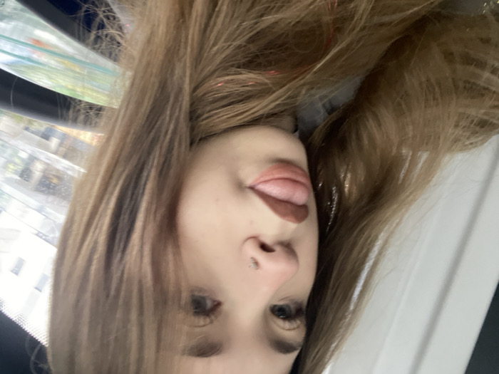 A woman angles her face towards the camera, sticking out her tongue. Her light brown hair cascades around her face and body. She has fair skin, with dark eye makeup and full, matte lips. A small piercing adorns her nose. The background appears to be the inside of a car, with glimpses of buildings visible through the window. A white surface is visible to the right. The image is rotated to the side.