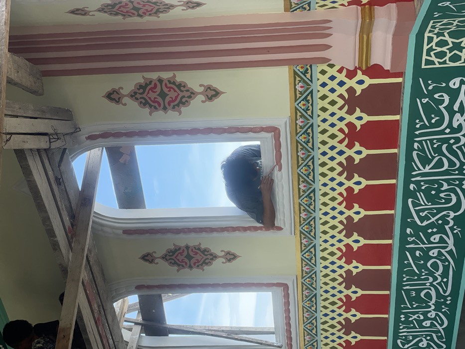 The image captures a detailed section of a building under construction or renovation in Kumbang, Indonesia, focusing on its exterior decorative work. Two individuals are present. A person with dark hair and wearing a dark grey-green t-shirt is observed leaning out of an arched window opening, actively painting the lower portion of the white, molded window frame with a reddish-brown substance using a small brush. A second individual, also with dark hair and wearing a dark shirt, is partially visible at the upper left, positioned on a wooden scaffolding structure. The building's wall features a light yellow/cream base. Between the two arched window openings, a large, symmetrical decorative motif in red, pink, and dark green is painted. Below the windows, the wall displays multiple horizontal bands of intricate patterns: 1. A narrow, solid gold stripe. 2. A band with light blue and dark green geometric scroll-like patterns on a white background. 3. A band with interlocking diamond shapes in yellow, olive green, and dark blue on a dark reddish-brown field. 4. A band featuring red, scalloped arch-like forms accented with blue teardrop elements, also on a dark reddish-brown background. The lowest visible section of the wall is a wide, dark green band adorned with elaborate white Arabic calligraphy. To the far right, a pinkish-brown fluted pillar with a gold-painted base is partially visible. The clear blue sky is seen through the unglazed window openings, indicating an outdoor, daytime scene.