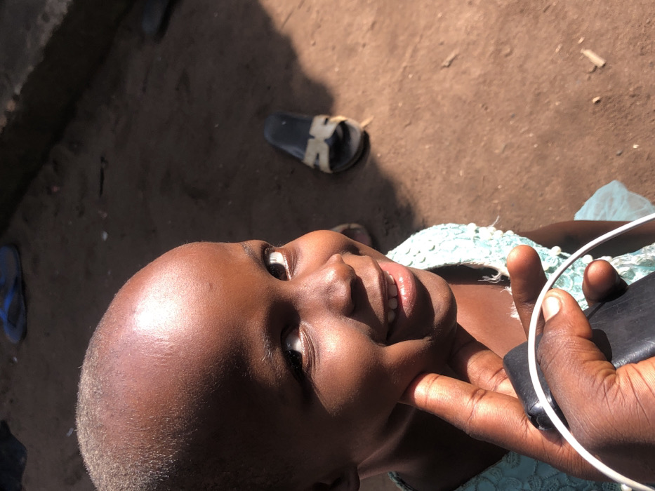 close-up, high-angle view of a young child in Orifite, Nigeria, situated outdoors on an unpaved surface. The child has dark skin, closely cropped hair, and is looking upwards and to the viewer's left with a wide, open-mouthed smile, revealing teeth. The child wears a light-colored, possibly pale blue or green, garment featuring textured or beaded detailing on the shoulder. A dark-skinned hand is present in the lower-left foreground, its fingers gently touching the child's left cheek. The hand holds a dark, rectangular object, likely an electronic device, with a white cable or cord looped around the fingers. The background consists of reddish-brown dry earth. Visible on the ground are a single blue flip-flop in the upper left and a single black and tan sandal in the mid-right. Direct sunlight illuminates the child's face and parts of the foreground, casting shadows elsewhere on the ground.