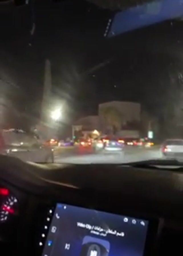 The video is shot from inside a car, looking out through the windshield at a street at night