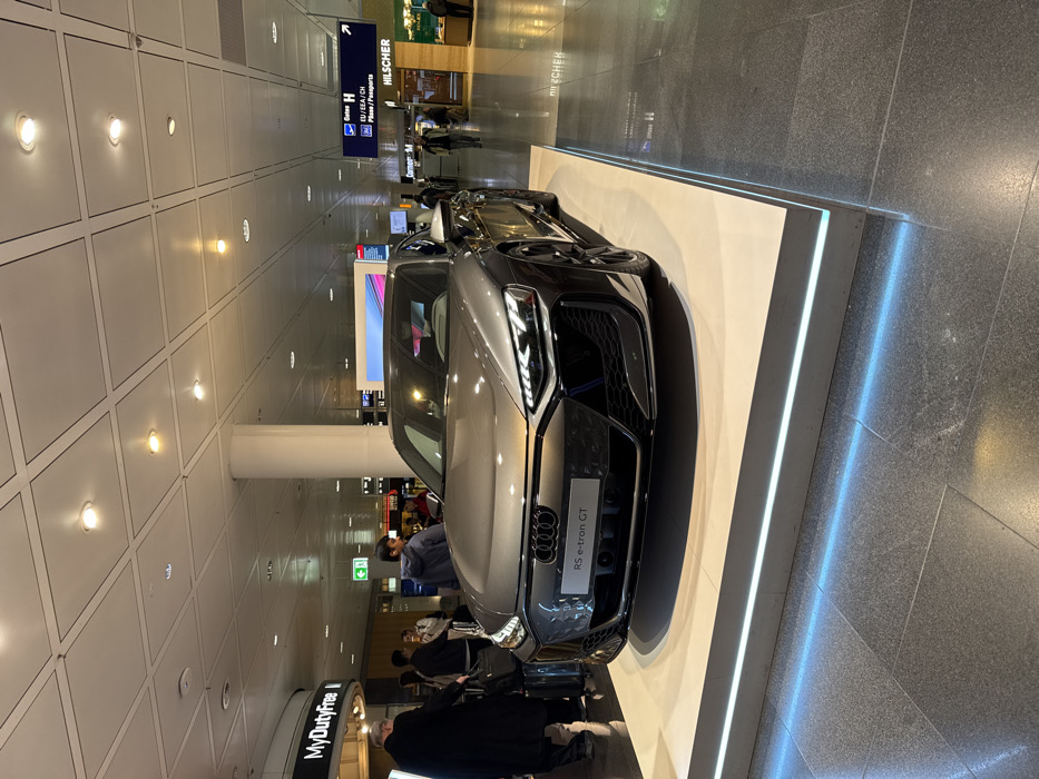 The scene depicts an interior view of a commercial area within Munich Airport, located in Oberding, Germany. A grey Audi RS e-tron GT electric vehicle is centrally displayed on a raised, rectangular white platform, which features a luminous blue LED strip along its base. The car faces slightly towards the left of the viewer, with its headlights illuminated. The immediate environment consists of a dark grey tiled floor and a white grid-paneled ceiling equipped with multiple recessed circular light fixtures. White support columns are interspersed throughout the area. In the left background, a "MyDutyFree" sign is visible above a cluster of individuals. One person, dressed in a dark coat, is partially visible from behind, appearing to attend to luggage. Other blurred figures are present in this section. In the right background, overhead signage indicates "Gate H" and "EU / EEA / CH Pässe / Paspoorten" (Passports), along with a "HILSCHER" store sign below. Several individuals are seen walking or standing in this area, consistent with general airport passenger traffic. Digital display screens are also faintly visible further in the background.