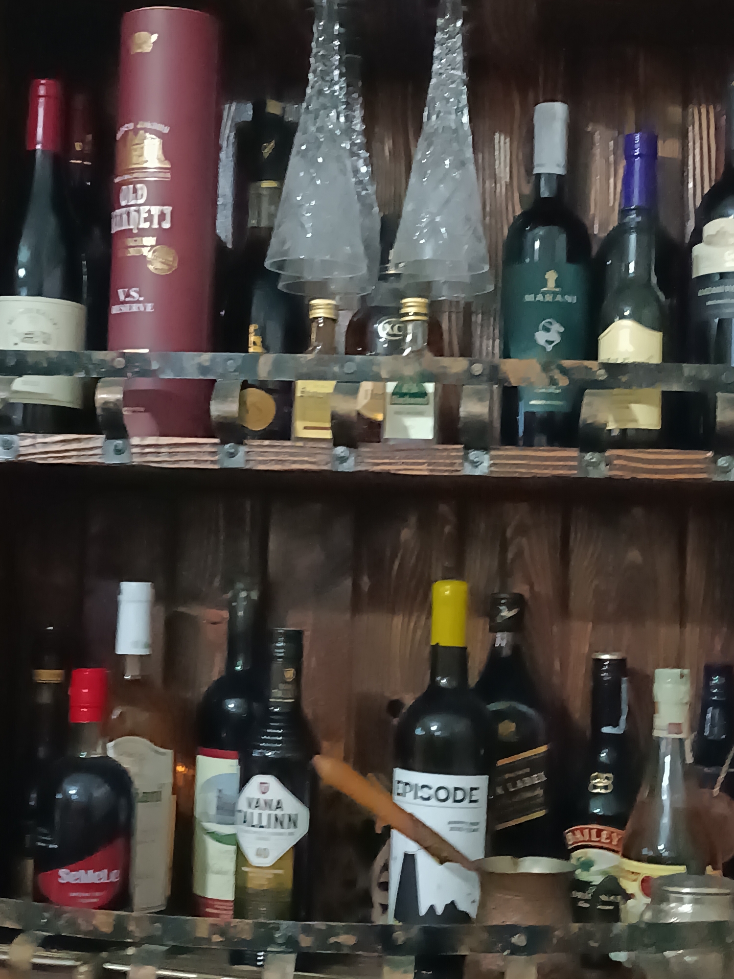 The image displays a two-tiered wooden shelving unit, likely a bar cabinet, filled with various alcoholic beverages and decorative items. The shelves are made of dark, rustic wood planks held by dark metal bands with visible rivets. On the top shelf, from left to right, a dark bottle with a white base label and red-foiled neck is visible. Adjacent to it is a tall, cylindrical dark red box labeled "OLD KVARETI V.S. RESERVE," featuring a golden bell emblem. Following this are two decorative, inverted clear glass pieces, resembling small chandeliers. To their right, a dark green bottle with a light green label displaying a white horse and the text "MARANI" stands next to another dark bottle with a purple-foiled cap and a light-colored label. Several miniature liquor bottles are positioned along the front edge of this shelf. The bottom shelf, from left to right, features a dark bottle with a red label marked "SeMeLe." Next is a clear bottle with a white cap and a light-colored label. A dark bottle with a prominent yellow cap and a white label bearing the text "EPICODE" is situated next to a dark bottle with a black label, partially obscured, showing "JOHN L." A wooden object, possibly a cigar or pipe, rests horizontally on the shelf in front of the "EPICODE" bottle. Further right are a dark bottle of "BAILEY'S" Irish Cream with a white and gold label, and a clear bottle with a pale yellow cap and label, which appears to be "Vana Tallinn." Based on the presence of Georgian brands "OLD KVARETI" and "MARANI," the location is identified as a collection within the city of Tbilisi, Georgia.