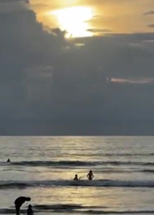 The video depicts a sunset scene on a beach. The sun is partially obscured by clouds, creating a dramatic light effect. The sea is calm with gentle waves. Several people are in the water, appearing to be swimming or playing. On the beach, a person is crouched down near a small child. The beach surface appears wet and reflective, mirroring the sky and light.