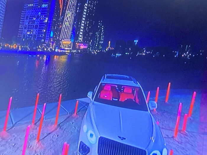 A white luxury SUV, identifiable as a Bentley Bentayga by its distinctive grille and badging, is parked at night on a light-colored surface, possibly sand or pavement, adjacent to a body of water in the city of Jos, Nigeria. The vehicle's interior features prominently bright red seats. Arranged around the front and side of the SUV, particularly to its right, are multiple vertical, cylindrical light fixtures emitting a vibrant magenta glow, embedded in the ground. A narrow, light-colored barrier or walkway separates these lights from the dark, rippled body of water. Across the water, a modern cityscape is visible, dominated by numerous tall, illuminated high-rise buildings. These structures display extensive blue, white, and some red/yellow architectural lighting, casting distinct reflections onto the water's surface. The environment is heavily illuminated by artificial light sources, creating a high-contrast nocturnal scene. No individuals are present.