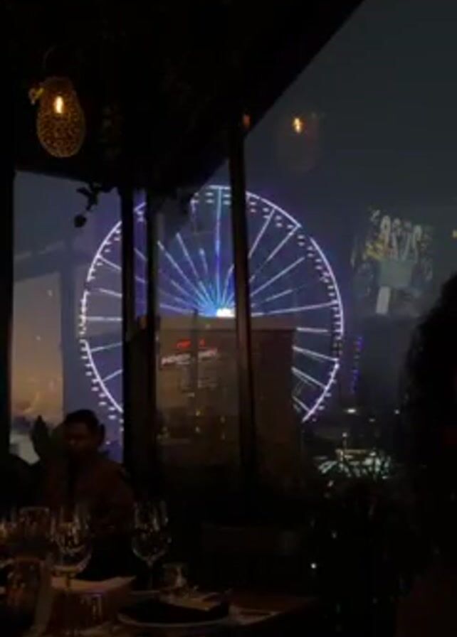 n indoor scene inside what appears to be a restaurant with a view of a Ferris wheel at dusk. The interior has dimly lit tables set for dining, with wine glasses, plates, and utensils visible. A man wearing a black shirt is seen standing by the window, looking out at the Ferris wheel. The Ferris wheel is illuminated with various colors of light. The view from the restaurant window suggests that it is located at a height, with a skyline visible in the background. There are hanging light fixtures and decorative plants within the restaurant.